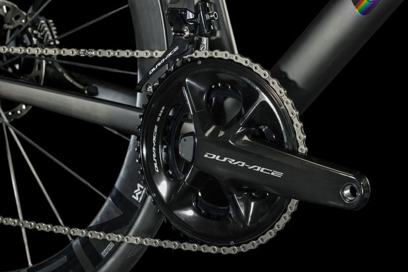 Die hochwertige Shimano Dura Ace Di2 Schaltgruppe inklusive Powermeter bringt deine Kraft aus den Beinen effizient auf die Straße und erlaubt präzises, sicheres Bremsen. Du willst ein rasantes, extrem schnelles Rennrad, um nach den Sternen zu greifen? Hier ist es!
