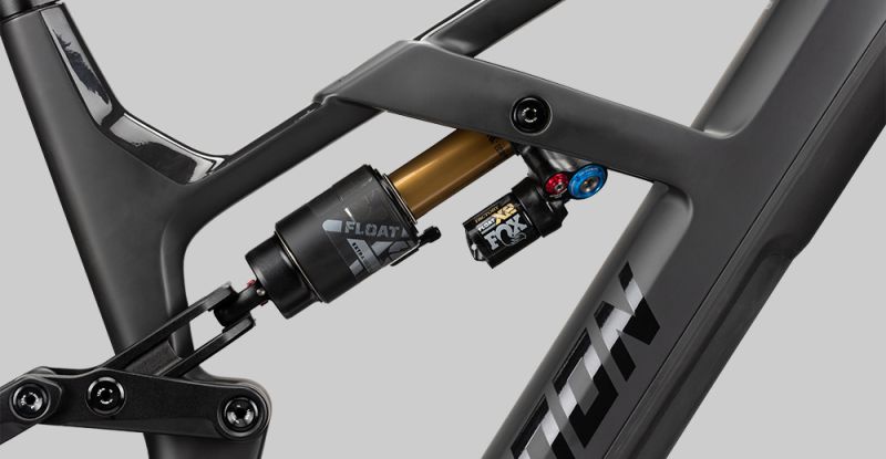 Der flügelähnliche Überwurf, welcher Ober und Unterrohr verbindet, macht nicht nur optisch was her, sondern bietet auch in technischer Hinsicht ein absolutes Highlight. Sowohl der Carbon-Hauptrahmen als auch die Trunnion-Dämpferaufnahme bewirken eine Menge Steifigkeit und Stabilität. Wie auch beim RENDER bietet die untere Dämpferaufnahme gleichzeitig einen Teil der Wippe, welche dem Rahmen eine einzigartige Kinematik und besonders hohe Stabilität des Hinterbaus verleiht. Der 750Wh große Akku wird durch eine Patrone in das Unterrohr integriert, die für geräuscharmes Fahren und einen wackelfreien Sitz sorgt. Durch eine gummierte Abdeckung, welche das Unterrohr abschließt, lässt sich der Akku problemlos und schnell entnehmen. Mittels der am Sitzrohr befindlichen Ladebuchse lässt sich der Akku ohne Entnahme laden. Das Schaltwerk wird am neuen, herstellerübergreifend genormten UDH hanger montiert, der Speedsensor ist elegant in der Bremsscheibe und Kettenstrebe integriert, sodass der klassische Speichenmagnet der Vergangenheit angehört.